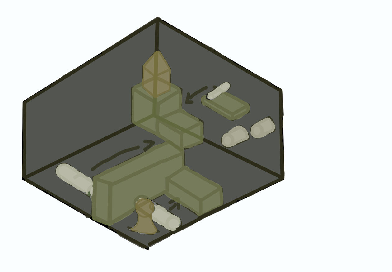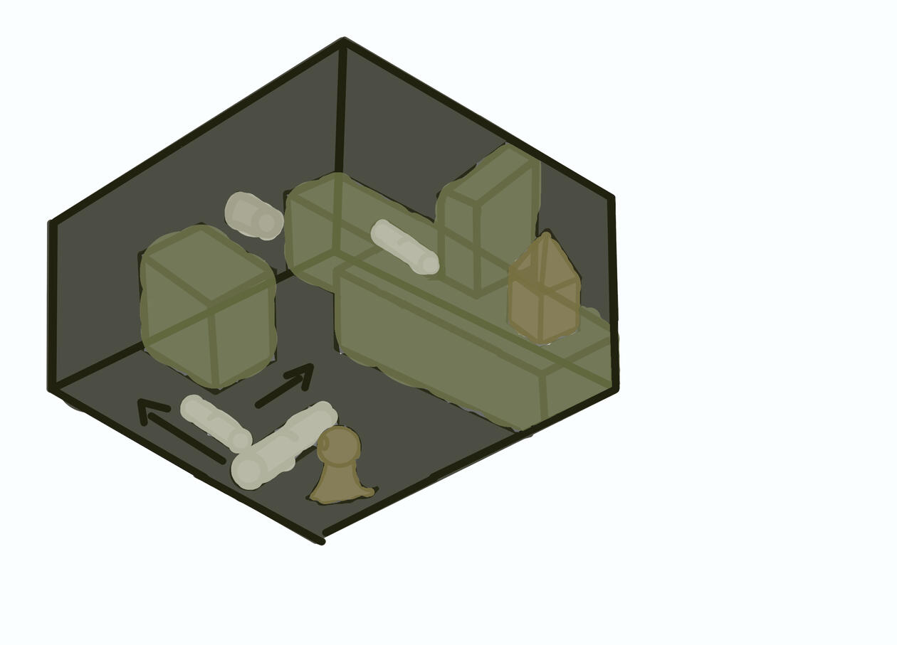 The example above shows the Player cramped in the corner. Our character on his own cannot jump high enough to reach the platform. But if they move the Cylinder forward they will soon realize it can be used as a platform extension to jump up. The next step will be to move two cylinders. to get to one you will need to do a little platforming to reach and push the cylinder. The next also just needs to be moved forward. Soon the player would've realized they made a staircase to platform up to the finish serving as a final challenge.