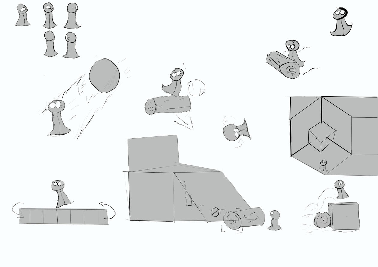 In most of these sketches the player is interacting with enviornment in a variety of ways. Most of which are have components of spinning around. Whether already moving or needing the player to interact with. Some of these cylinders pushed around and can be used to get higher ground. We can focus on more puzzle elements with this and can present the player with multiple mini challenges.